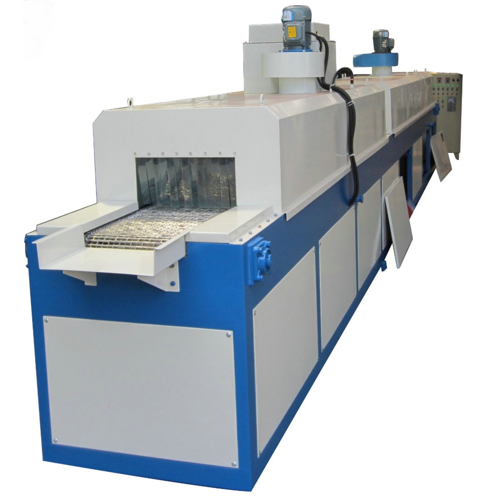 Hot air drying system is composed of a hot air heater, a circulating fan, hot air drying tunnel and temperature control system. The wind sent by the circulating fan is heated to produce 130 degrees Celsius temperature of the hot air to drying the workpiece.